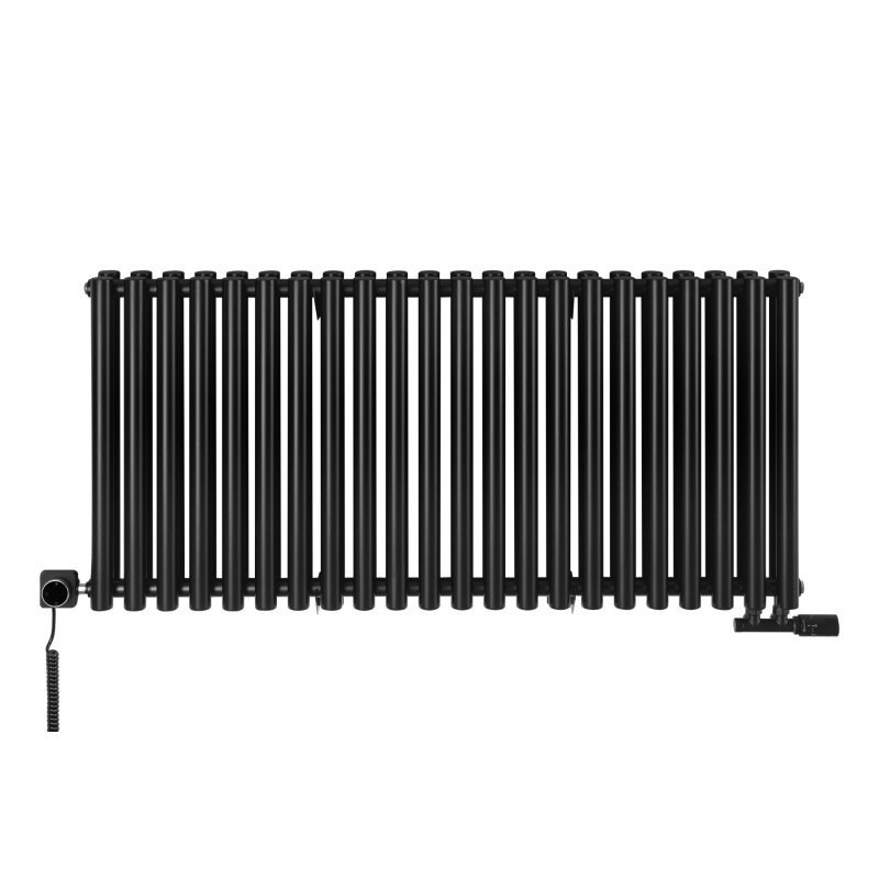 Grzejnik dekoracyjny hybrydowy Gilda 600x1298 czarny SQUARE to elegancki model łączący funkcję ogrzewania wodnego i elektrycznego. Wyposażony w podwójny rząd pionowych, okrągłych rur, zapewnia wysoką moc grzewczą i równomierne rozprowadzanie ciepła. Elegancki design w matowej czerni doskonale komponuje się z wnętrzami nowoczesnymi i minimalistycznymi. Grzałka elektryczna SQUARE dzięki połączeniu z Wi-Fi i łatwemu interfejsowi umożliwia komfortowe sterowanie temperaturą niezależnie od instalacji centralnego ogrzewania, a zawór Multiflow INVEST zapewnia najwyższą funkcjonalność i przyjemność użytkowania.
