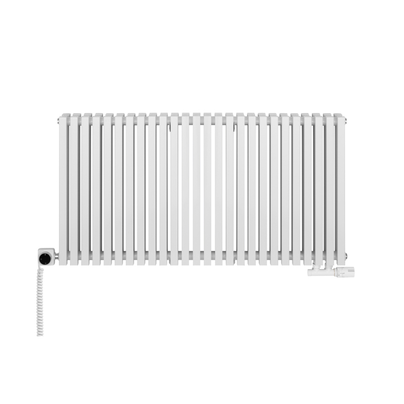 Grzejnik dekoracyjny hybrydowy Nomad 600x1170 biały SQUARE to nowoczesne rozwiązanie łączące ogrzewanie wodne i elektryczne. Wyposażony w dwa rzędy pionowych paneli o prostokątnym przekroju zapewnia wysoką wydajność grzewczą oraz równomierne rozprowadzanie ciepła. Klasyczny design w subtelnej bieli doskonale komponuje się z wnętrzami jasnymi i w stylu skandynawskim. Grzałka elektryczna SQUARE dzięki łatwemu interfejsowi i połączeniu z Wi-Fi umożliwia komfortowe sterowanie temperaturą niezależnie od instalacji centralnego ogrzewania, a zawór Multiflow Invest sprawia, że korzystanie z grzejnika jest czystą przyjemnością!