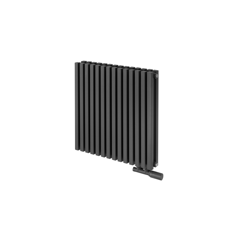 Grzejnik dekoracyjny Nomad ND2E 600x630 w kolorze grafitowym to nowoczesna propozycja dla tych, którzy szukają równowagi między designem, a funkcjonalnością. Jego pozioma forma oparta jest na dwóch rzędach starannie rozmieszczonych, prostokątnych profili, które tworzą spójną, geometryczną strukturę o wyjątkowo estetycznym wyrazie. Dzięki kompaktowym wymiarom model ten idealnie sprawdzi się w niższych przestrzeniach, takich jak podokienne wnęki, korytarze czy łazienki.
