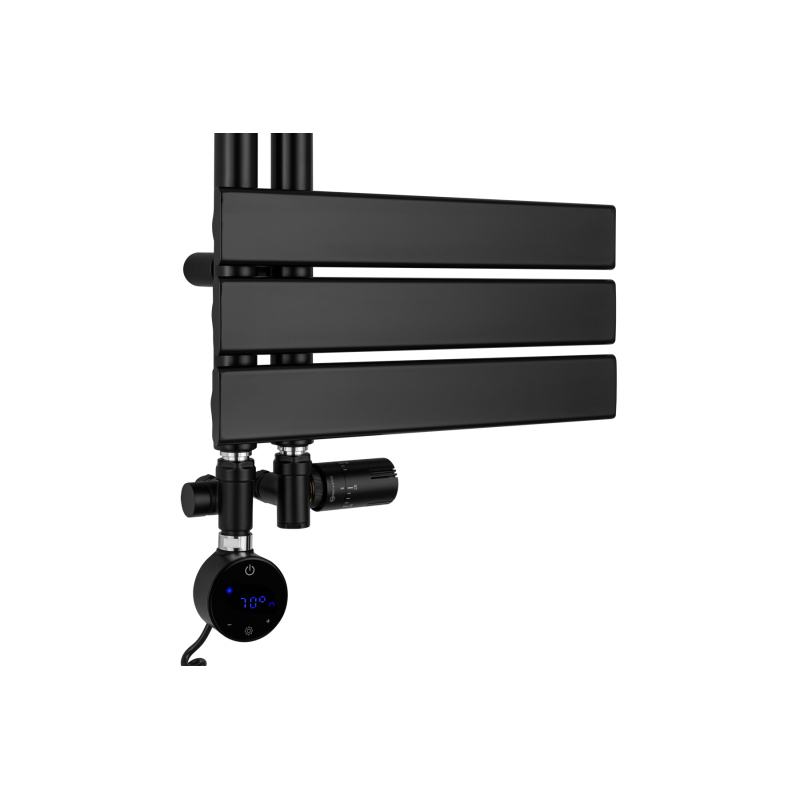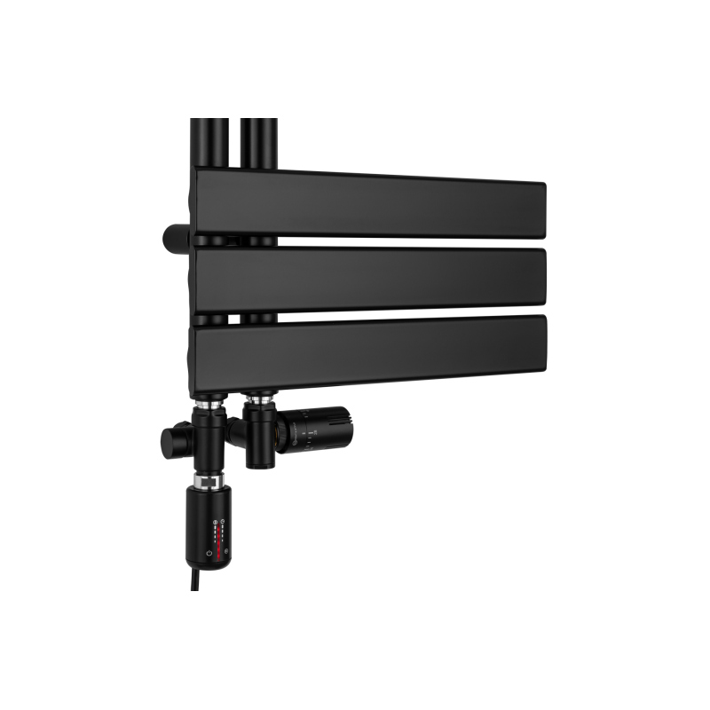 Grzejnik łazienkowy Uncommon Asymmetrical 700x400 w kolorze czarnym to stylowe rozwiązanie do nowoczesnych i funkcjonalnych wnętrz. Charakterystyczny układ poziomych profili, przesuniętych asymetrycznie na jedną stronę, łączy minimalistyczną estetykę z wygodą użytkowania. Dzięki otwartej konstrukcji umożliwia szybkie odwieszanie ręczników i sprzyja utrzymaniu porządku w codziennej rutynie. Model dostępny jest w wersji wodnej, elektrycznej lub hybrydowej, co pozwala dopasować go do stylu życia domowników i rytmu sezonu. Posiada dolne podłączenie o rozstawie 50 mm z możliwością wyboru strony.