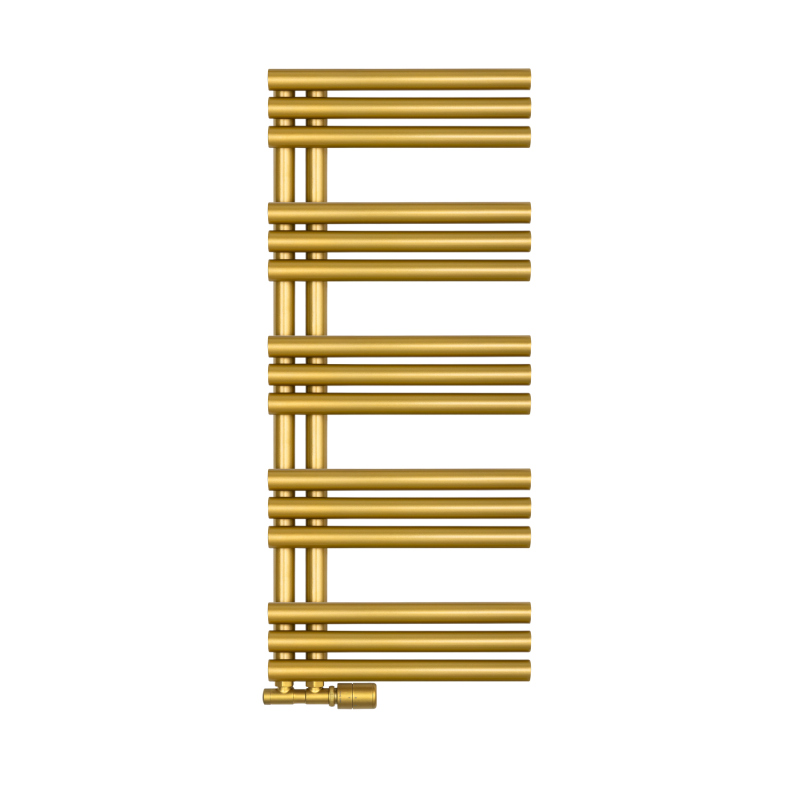 Grzejnik łazienkowy Zodiak 942x400 w kolorze złotym to nowoczesny i funkcjonalny grzejnik zaprojektowany z myślą o współczesnych łazienkach. Jego asymetryczna konstrukcja nie tylko przyciąga wzrok, ale także zwiększa komfort codziennego użytkowania – ułatwiając np. wygodne zawieszanie ręczników.