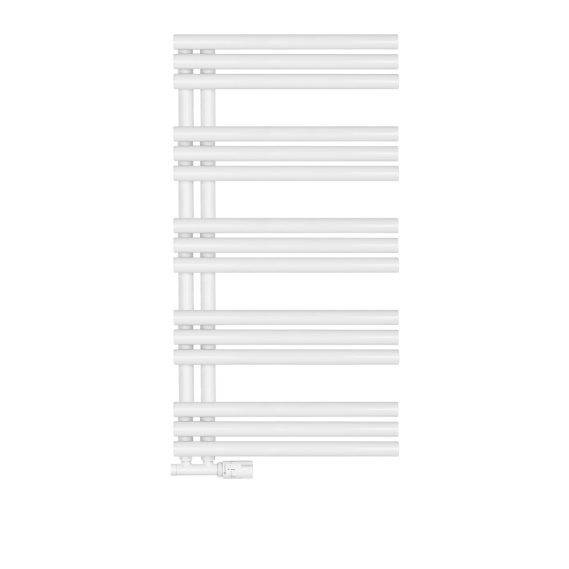 Model Zodiak został wykonany z wysokiej jakości profili o przekroju okrągłym, co nadaje mu lekki, elegancki wygląd i podkreśla jego nowoczesny design. Grzejnik posiada dolne podłączenie o rozstawie 50 mm, możliwe do wyboru po lewej lub prawej stronie, co zapewnia elastyczność montażu i łatwe dopasowanie do istniejącej instalacji.