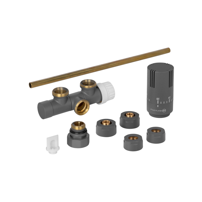Zawartość opakowaniaZawór termostatyczny, zawór odcinający, głowica termostatyczna, złączki do rur PEX16x2. W przypadku innych rur złączki należy dokupić oddzielnie.