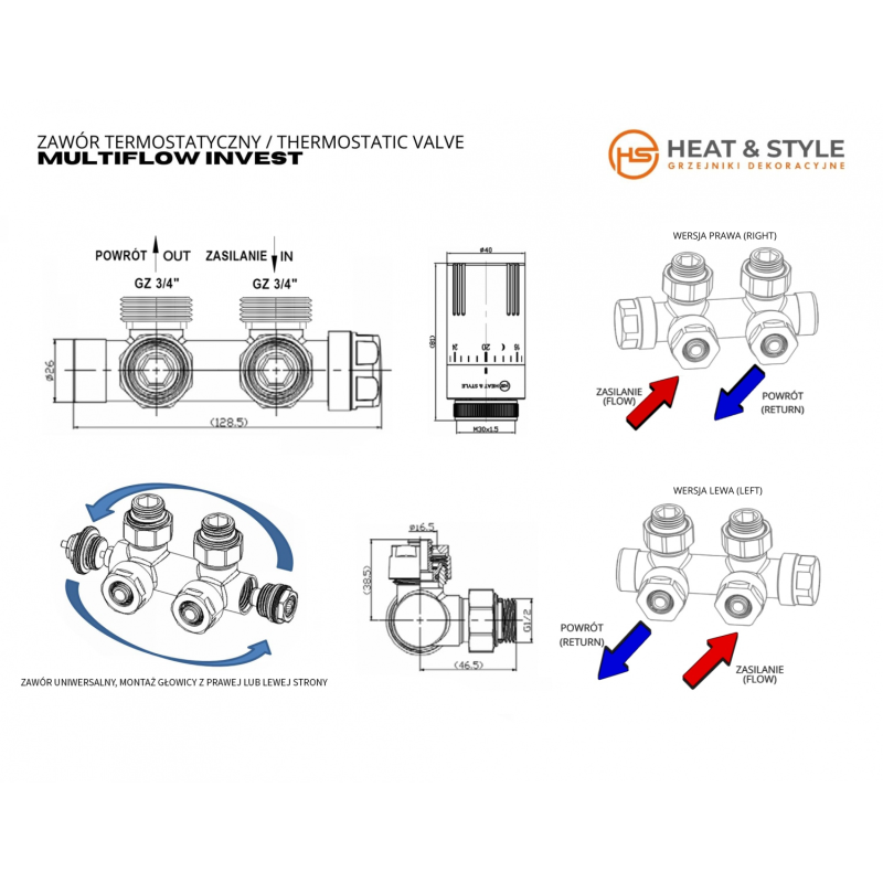 Zawór termostatyczny zespolony MULTIFLOW INVEST, czarny prawy